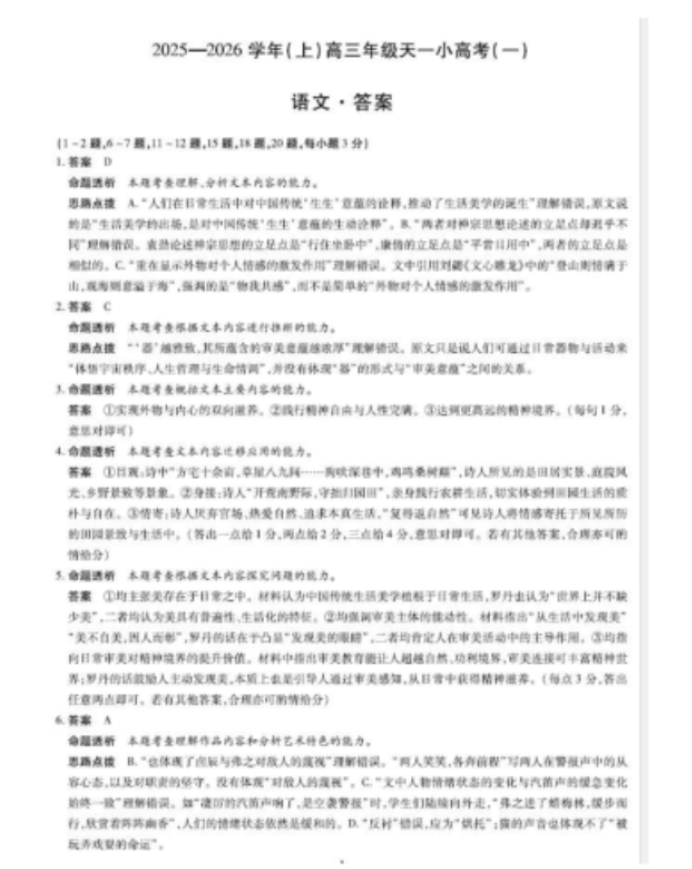 河南天一大联考2026届高三天一小高考(一)语文试题及答案